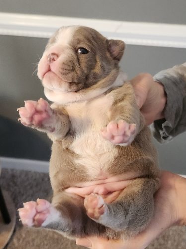 Blaze & Blue Smoke male pup born 1-21-26, he was the only pup in the litter. This is a repeat breeding that produces some extremely nice Bostons. He is $1300. We will accept a deposit of $300 to reserve him (that goes towards the total). He will come with full CKC registration & a one year health guarantee against any congenital defects. He will be ready to go March 18th. Sorry no Air Shipping, pups must be picked up in person or we have some great groundshippers we can put you in contact with if needed. If you’d like reserve this pup, please text Jason at: 252-258-5175.