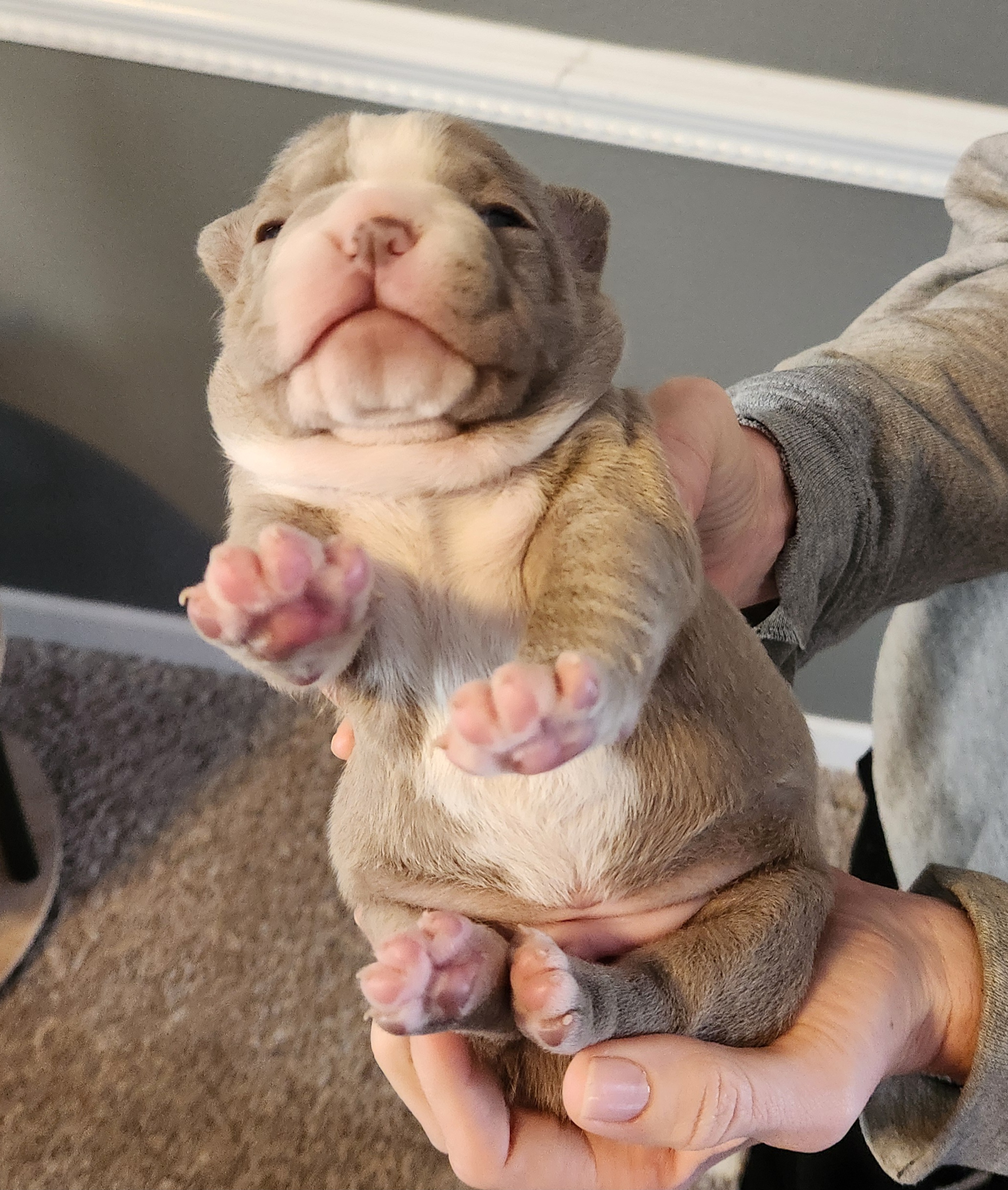 Blaze & Blue Smoke male pup born 1-21-26, he was the only pup in the litter. This is a repeat breeding that produces some extremely nice Bostons. He is $1300. We will accept a deposit of $300 to reserve him (that goes towards the total). He will come with full CKC registration & a one year health guarantee against any congenital defects. He will be ready to go March 18th. Sorry no Air Shipping, pups must be picked up in person or we have some great groundshippers we can put you in contact with if needed. If you’d like reserve this pup, please text Jason at: 252-258-5175.